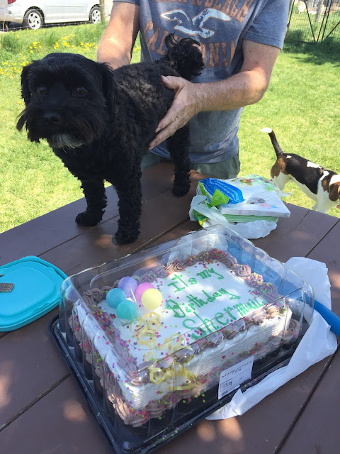 The people at the dog park are a hoot. Not only do they bring healthy treats to share with all the dogs, they bring treats for the humans as well. Fortunately, they don't get carried away with the "healthy" stuff for the people. So far, we have enjoyed popsicles, donut holes, cupcakes, and last week there was birthday cake when "Sherman" turned two.